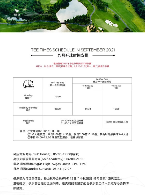 驿山高尔夫俱乐部提前祝您及家人中秋佳节快乐,请您关注9月运营安排。