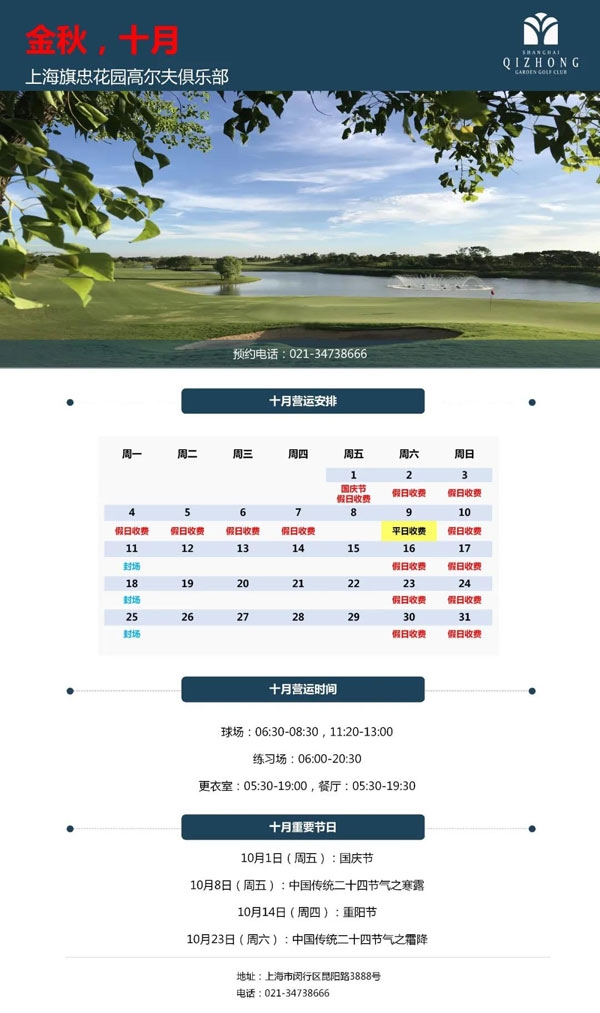 金秋十月,愿所有美好与您不期而遇,秋风徐来,尽享旗忠繁华。现将上海旗忠花园高尔夫俱乐部十月营运时间安排公告如下,敬请留意!