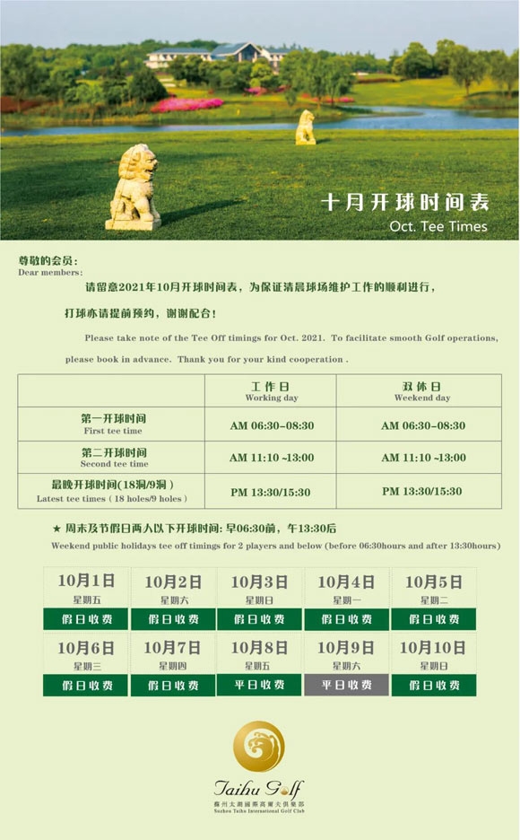 苏州太湖高尔夫俱乐部十月开球时间表