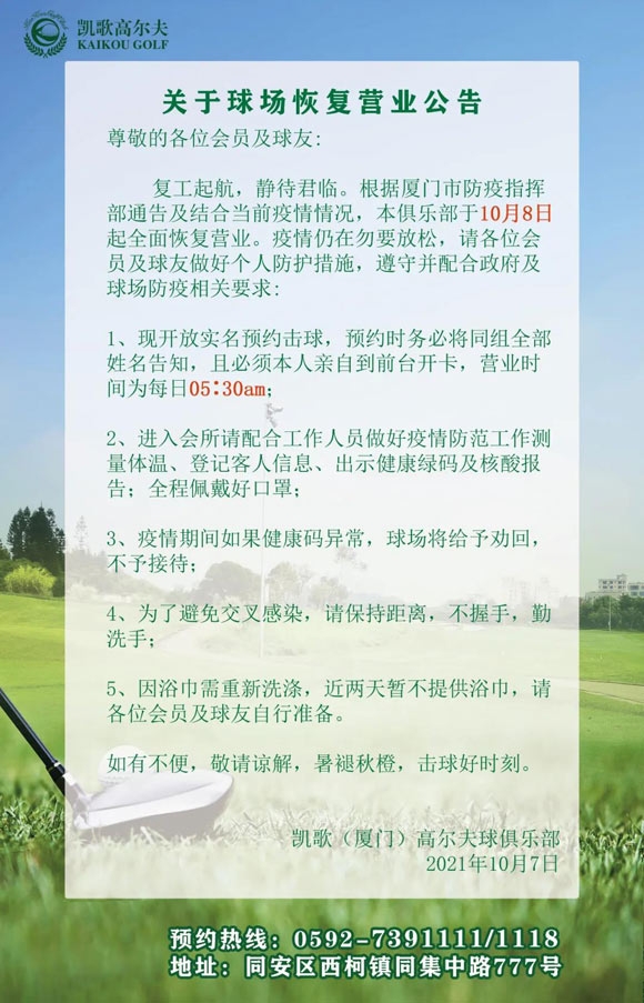 厦门凯歌高尔夫球场恢复营业公告!