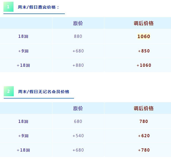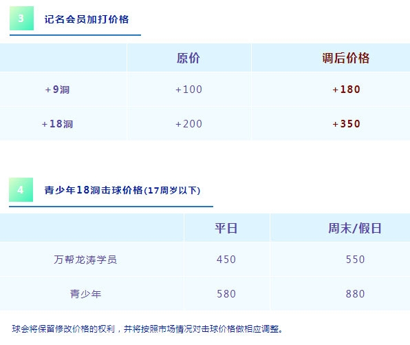 随着球场运营、维护、人力成本的大幅上涨,为确保球场健康运行,能持续改善并提供高品质服务,经球会审慎研究决定,自2021年10月16日起,万帮龙涛高尔夫击球价格作以下调整: