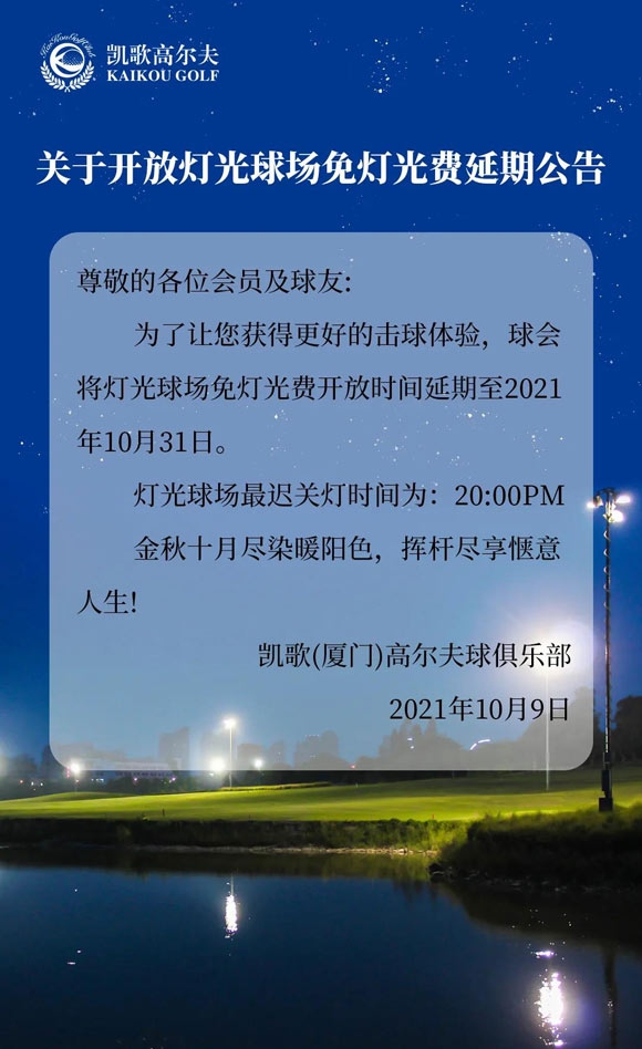 厦门凯歌高尔夫开放灯光球场免灯光费延期公告!