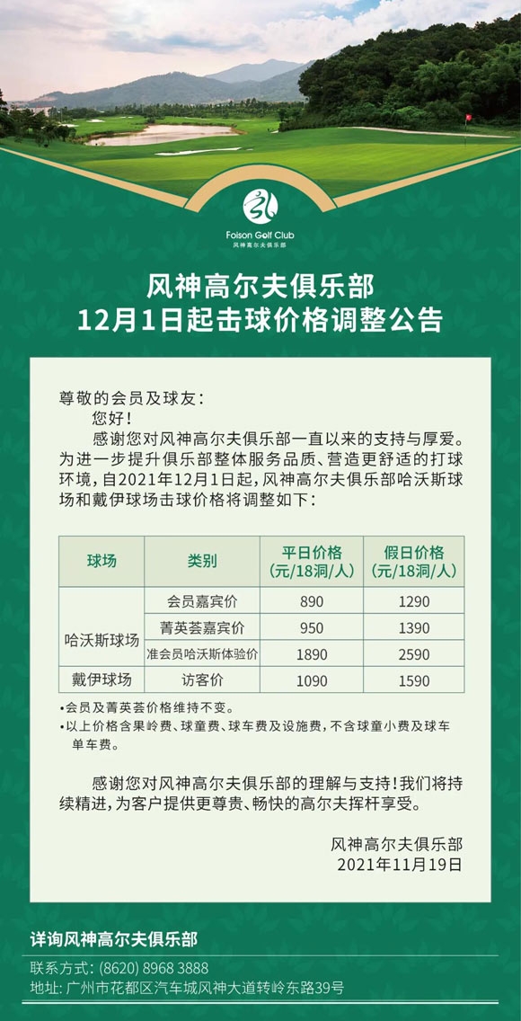 广州风神俱乐部击球价自12月1日起调整
