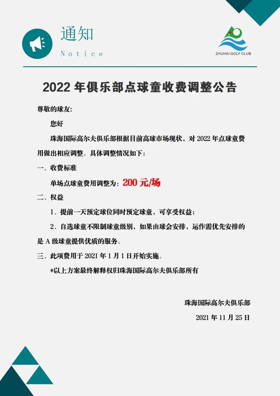 2022年珠海国际高尔夫俱乐部点球童收费调整公告