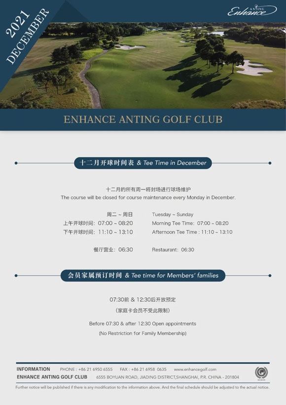 十二月,颖奕安亭高尔夫俱乐部上午的开球时间将延后至上午7:00 - 8:20;相应的,餐厅的营业时间调整至上午6:30。下午的开球时间为11:10 - 13:10,不分平假日。