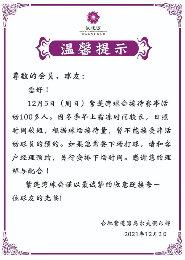 合肥紫蓬湾国际高尔夫12月5日赛事温馨提示