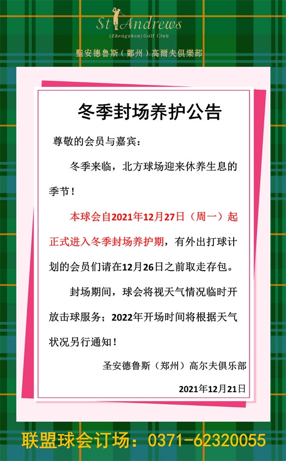 圣安德鲁斯(郑州)高尔夫球会2021-2022年度封场养护公告