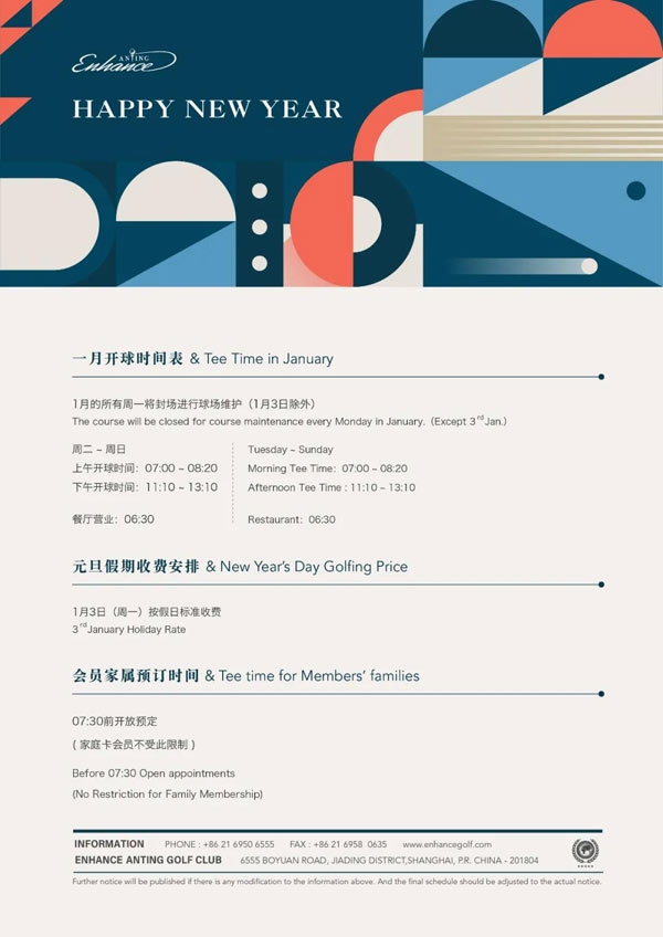 明年一月份,颖奕安亭高尔夫俱乐部开球时间为上午7:00 - 8:20,下午11:10 - 13:10;餐厅开始营业时间为上午6:30。