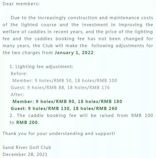 深圳沙河高尔夫球会调整夜场灯光费及球童点号费的通知