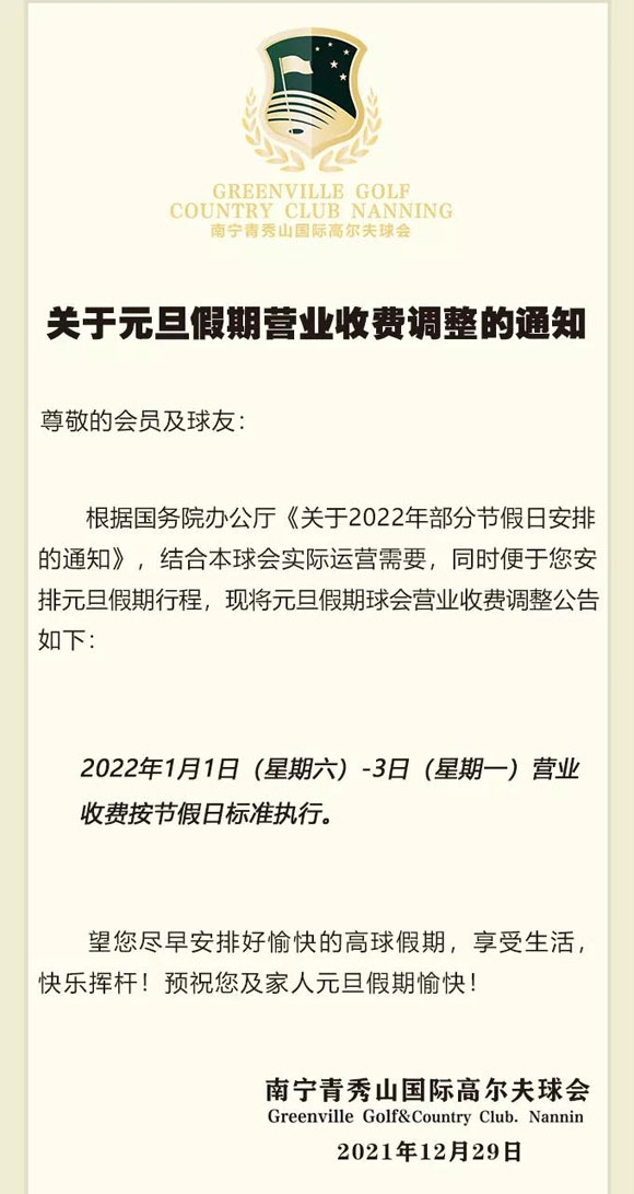 南宁青秀山高尔夫2022元旦假期营业收费调整通知
