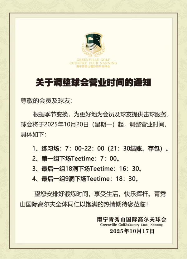 南宁青秀山高尔夫球会调整营业时间的通知