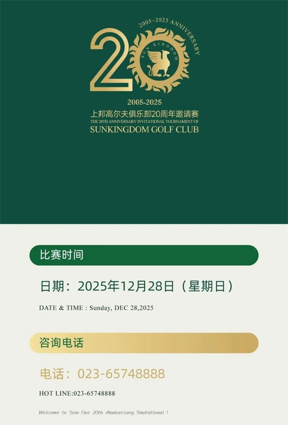 2025年12月,俱乐部将迎来成立20周年。至此重要时刻,诚邀您出席"上邦高尔夫俱乐部20周年邀请赛",让我们一起回顾珍贵的历史时光,共同畅想未来的美好蓝图,共襄这段值得被铭记的重要历程。
