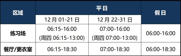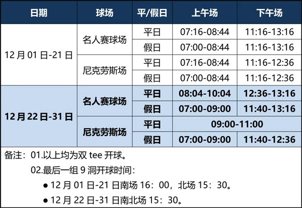 冬日暖阳,绿意依旧。随着12月的到来,球场也换上了别样的冬装。美兰湖俱乐部对12月份营业安排作相应调整,具体安排如下: