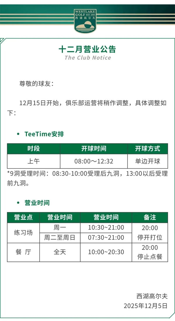 杭州西湖高尔夫俱乐部十二月营业公告!