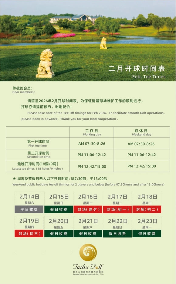 Feb.Tee Times | 苏州太湖国际高尔夫俱乐部二月开球时间表