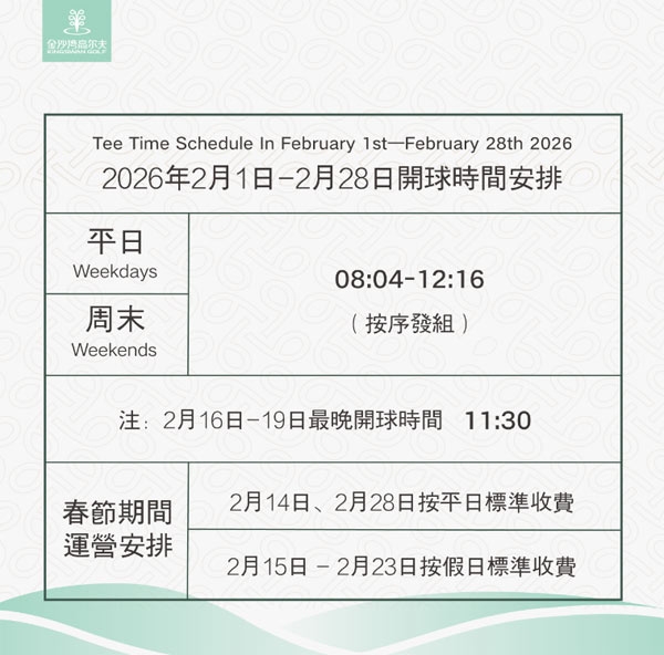 您好!金沙湾乡村俱乐部2月开球时间安排如下: