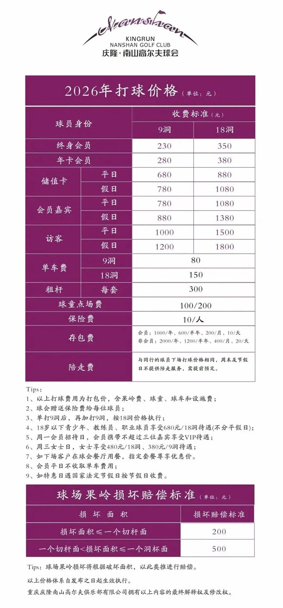 重庆庆隆南山高尔夫2026年打球价格: