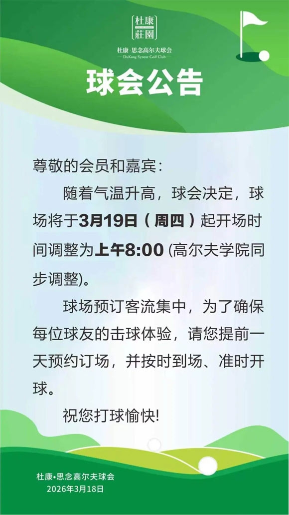 公告|杜康·思念高尔夫球会开场时间调整公告