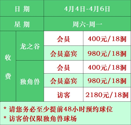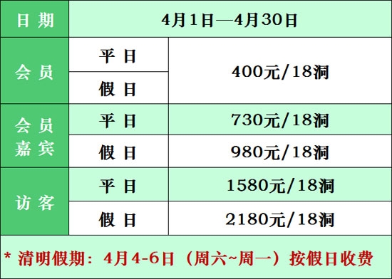 大连红旗谷高尔夫俱乐部4月份营业安排