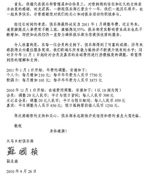 上海天马高尔夫俱乐部击球费用及年费调整通知