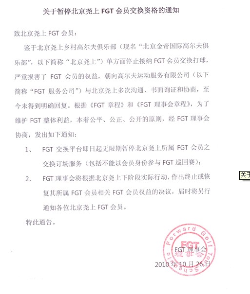 关于暂停北京尧上FGT高尔夫会员交换资格的通知