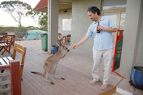 高尔夫杂志的塞思在球场的路边小屋同一只袋鼠打招呼。 Nullarbor高尔夫球场,实际上,也是数目庞大的袋鼠的家。