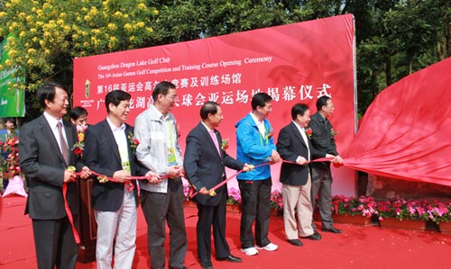 11月16日上午,2010年第16届亚运会高尔夫竞赛及训练场馆揭幕仪式在广州九龙湖高尔夫球会隆重举行。国家体育总局,中国高尔夫球协会,广东省、市政府,广州市亚组委袁伟民、蔡振华、林木声、刘泽彭、蔡东士、张小宁、王立伟、许德立、杨廼军、王禹平、刘江南、花都区领导以及广东省高尔夫球协会副会长、广州九龙湖高尔夫球会董事长冯地等出席揭幕仪式。
