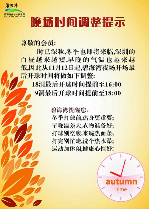 深圳碧海湾高尔夫俱乐部秋冬晚场时间调整