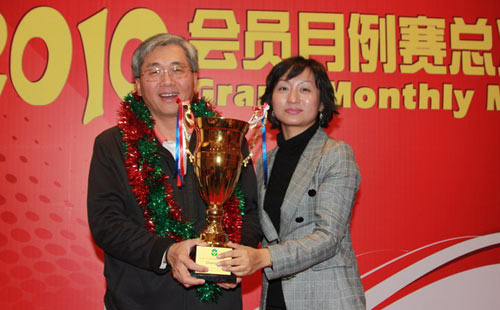 经过四个多小时的激烈比拼,2010年旭宝高尔夫俱乐部的年度冠军火热出炉---A组冠军:来自台湾的会员蔡明旭先生,总杆88,差点16,净杆72;B组冠军:来自韩国的会员Roh Run Hee女士,总杆88,差点19,净杆69。俱乐部为颁奖典礼准备了丰盛的晚宴和奖品,会员张宝琨成了当晚的大嬴家抽奖得到了一套价值八千的MIZUNO铁杆.