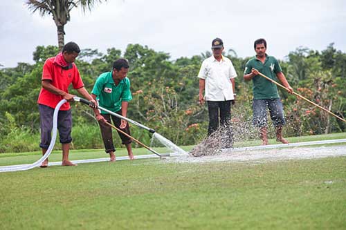 虽然很多球场职员的家都被火山给毁了,他们还是义务来到球场,协助球场清理火山灰,希望能早日让球场重新营业。
