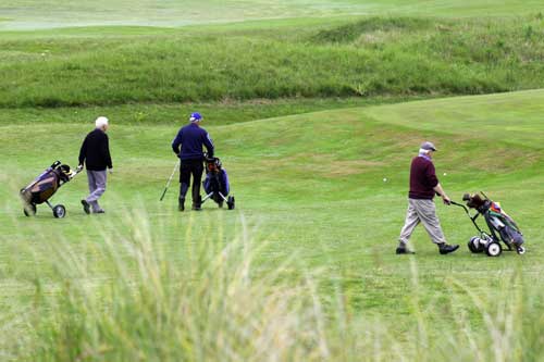 甚至在我见过苏格兰的许多昂贵美丽、古老球场之后,我依然怀念这个小9洞球场带来的震撼——依海而建,站在球场上,海风拂面,你自然生出一种无限自然的苍茫感觉。小球场就在村落边,连接村落和海滩的柏油路将球场切成两块,球场人少的时候,当地人根本不走那条路,我一直看到牵着狗的当地人在球场上散步,狗厌倦绿色草地的时候,主人就拉着它走向海边,甚至连晨跑的人也会先跑一圈球场再到海边。