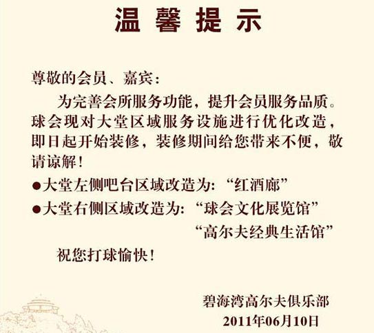 深圳碧海湾高尔夫俱乐部会所大堂改造温馨提示