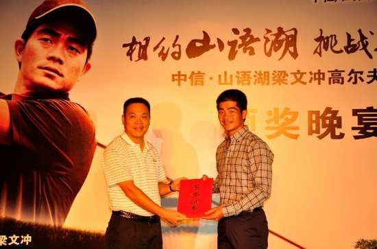 在随后的颁奖晚宴上,梁文冲亲手为获奖者颁奖并与他们合影留念。中信山语湖领导刘裕兴先生现场向梁文冲颁发了中信会山湖俱乐部名誉会员的证书,梁文冲表示成为名誉会员后,今后将有更多机会与中信山语湖的业主和嘉宾一起打球和交流。现场梁文冲宣布了他一定会出席今年下半年举行的“中信山语湖第四届高尔夫精英邀请赛”,并相约业主嘉宾们下半年再相约山语湖。至此,此次“相约山语湖,挑战梁文冲”高尔赛完美落幕。