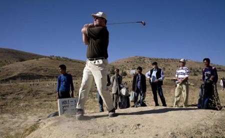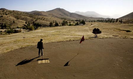 喀布尔高尔夫俱乐部,阿富汗惟一的高尔夫球场,它只有9个洞。一般来说,一个标准球场至少应有18个洞。无论用哪种标准来看,这个高尔夫球场都极为简陋。这里没有草,球场一片黄沙灰土,岩石密布。果岭不是绿色的(果岭是英文GREEN的音译,是球洞周围的一片管理精细的草坪)而是沙土和机油混合成的黑色。但是在许多外国人看来,这个球场更像是收割之后的豌豆田。