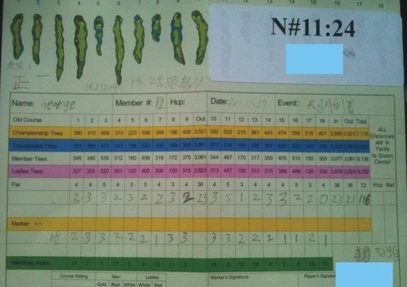 最后贴今天的记分卡,无水份的116.(高尔夫就是自己跟自己过不去的运动,所以记分一定要严格,另外不可以抛的杆绝不抛,可以抛的球,按规则抛,一根杆的距离。)