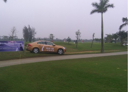 第三洞是三杆洞,一杆进洞就设在这个洞。S60就停在旁边!!发球台边上有一个工作人员挨个拍照,果岭边还有保险公司的人在猫着,鸡动哪,185码,小逆风,小妹直接递过来5铁,恩,真知我心哪。试挥,感觉很好,妥了,上杆下杆,一气呵成,一触球我就知道很甜了,果然球直飞向旗杆,旁边的人都在喊:有了!有了!,球在旗杆前落下,弹了两下,球不见了!边上的人那个鸡动哪,我立马看果岭边上的保险公司工作人员,结果他在摇手过去一看,是个双层果岭,旗杆前有个小坡,我的球过了坡,但离洞还有一码多这样子,唉,俺离S60竟然如此之近哪!最后鸟推变帕。