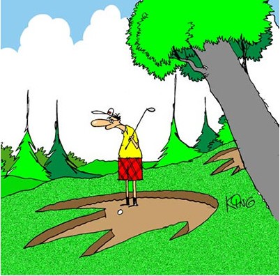 第一洞,4杆洞,360码左右。开球选用了智商的打法,放弃一号木,三号木开球,与董刚一号木差距5码。据果岭120-125码,ON果岭,略小,准备上坡推杆。董刚打大,比我长的下坡推。董刚三推!开心!我第一推,推右过洞后,斜滚向左我推球方向滚动了5码,第二推压洞边略停在洞口后,突然滚下了3码,第三推压洞杯未进,4推,两上四推+2(心想:MD,这是什么诡异的果岭)球童告诉我这只是开始。