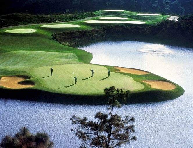 Robert Trent Jones设计的湖景球场则是另外一种风格,依山临湖而建的球道如梯田一般,蜿蜒于山涧湖畔,有一种特别的、令人震撼的美。这种设计极具挑战性,因为沟壑纵横、山地陡峭的地形地貌很容易形成设计的盲点和难点,如何在不破坏自然地势的前提下寻找一种击球的挑战性和合理性的平衡,对设计师的功力无疑是一个考验。但Robert Trent Jones做到了这一点,不仅是做到了,简直是鬼斧神工,精妙绝伦。我以为,这是梯田式球道设计的一种极致,逼仄中透出一种大气,挑战中感受一种舒畅,风光无限,流连忘返。湖景球场最美的球洞当属第9洞,这个短而窄的5杆洞位于湖岸边,左侧山花烂漫,异彩纷呈;右侧碧波荡漾,水光接天。果岭立于犬牙交错的堤岸之上,三面环水,湖光山色尽收眼底。
