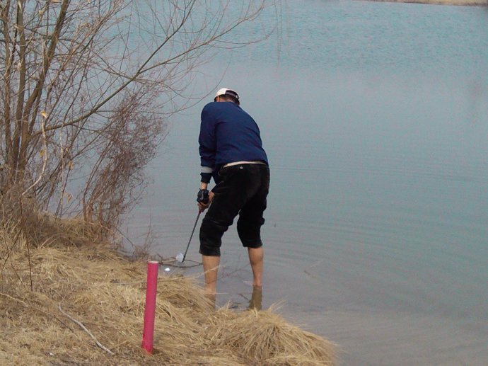 连打了3个。上果岭后发现他的第2、3个球都活着,但第一个不幸刚刚落水。老哥二话不说,坐地脱鞋。我说:“哥你玩命呀,我们俩都4上了,你们肯定赢了,算了吧。”“没事,我觉得没问题”。今天我和王兄还单比杆,看他那么坚决我也不好说什么了。于是就有了如下的节目: