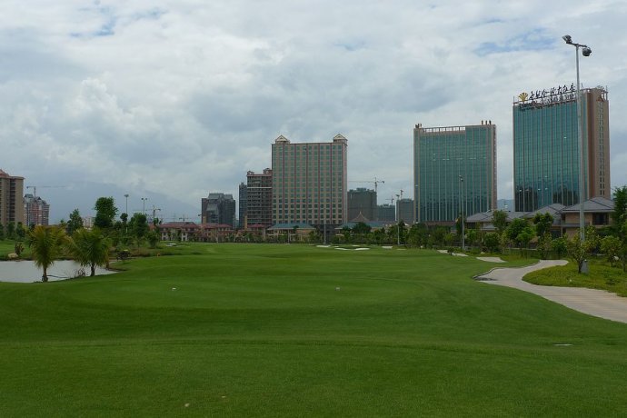 云南西双版纳的首府景洪的世纪金源球会,位于澜沧江畔,是在沼泽地上填出来的球场。球会有27洞,前一段已经建好18洞开业,现在后九的草有些问题,进行封场养护,所以只能打前九。球场的总长度7076码,地势平坦,球道比较宽,障碍区不多,比较好打。果岭的速度在8.5左右,有些起伏,需要认真对待。