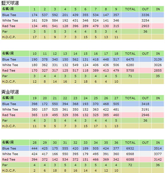 标准杆数: 蓝天:71杆,黄金:72杆