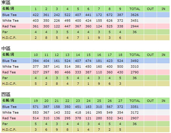 标准杆数: 东区36杆,中区36杆,西区36杆