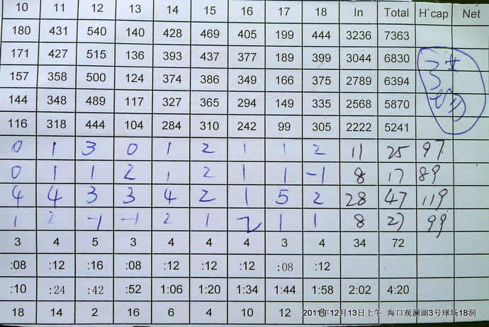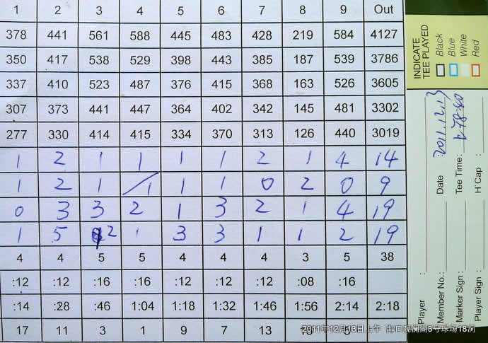 因为昨天两场球都骑了大型三轮车,我不得不深刻反省自己的挥杆动作。就在这个球场打了几个洞之后,挥杆之前多试挥几次,每次试挥都换一种挥杆动作。完了是那一洞,我开始刻意伸直左臂,腰部肌肉启动和扭转,减少用手打球的意识,一号木居然又远又直,这个偶然的发现让我惊喜不已,接下来的挥杆全部复制这种机制,效果非常明显,前九还是加19,临场改动作之后,后九就只加了8,积分卡上记的是99。比昨天好多了。
