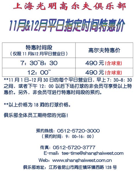 490元/18洞 上海光明高尔夫11月-12月指定时间特惠