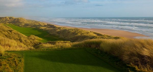 特伦普国际林克斯球场-苏格兰——苏格兰阿伯丁;第14洞:标准杆4杆,长度445码 你得爬上高耸的后面的发球台才能把整个美景都尽收眼底,但你这么做绝对是值得的!北海那壮观的,没有掩藏的美景,海滩还有类似圆形剧场般的沙丘包裹着比看上去更宽阔的球道。