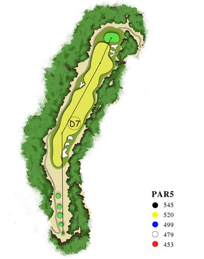 D场7#(将军洞)—— 顿生将军胆定上将军山的豪情 以将军山为背景的三杆洞, 具有独特的从低处往高处打的特点,落差将近20米。发球台与果岭处于断谷两端,属于典型盲洞;发球杆的选择是关键,果岭面积较大,建议球员选小一号杆;推杆时需注意力度的控制,果岭分为双层、走势左高右低,起伏较大。