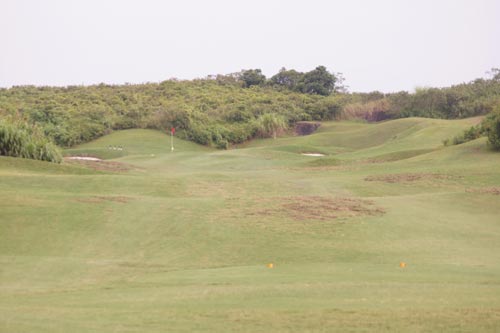 这果岭是上斜的,因此发球距离不足会导致球滚下来。而发球距离过远亦有可能打进果岭后的树林而导致失球,所以球手需要注意的是正确选择球杆。