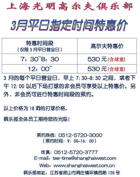 530元/18洞 上海光明高尔夫3月平日指定时间特惠