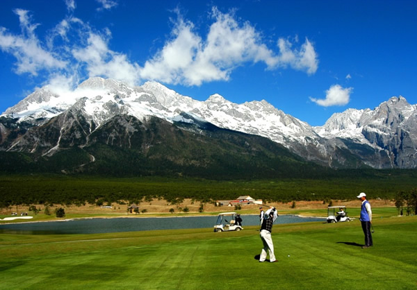 玉龙雪山球场的会所就建在山谷东边的山麓上,山谷的西边就是著名的玉龙雪山主峰。站在会所室外的二层平台上,往下看,是散布在地势平缓的山坡上的碧绿球道,金色带阳光倾泻而下,往远处看,是白雪皑皑的玉龙雪山主峰,在尖峰之上静静的飘浮着一团团洁白的白云,在这一幅由自然大师用神来之笔完成的壮丽画卷面前,我们都惊呆了,至少惊呆了十分钟,在确认没有高原反应之后,大家不分老少,一起欢呼跳跃起来,感谢上帝,赐给我们如此美妙的打球环境。