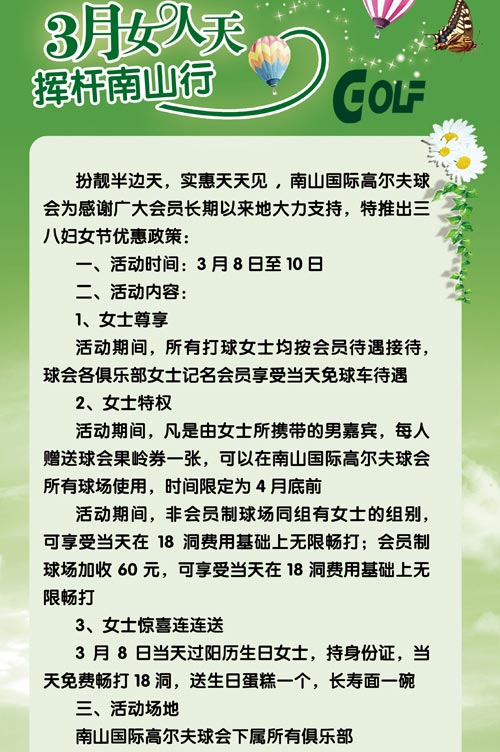 免球车费 南山国际高尔夫三八妇女节优惠政策